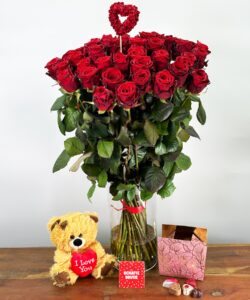 Möchten Sie Ihre/n Liebste/n mit dem ultimativen Liebesgeschenk überraschen? Dann bestellen Sie jetzt diesen wunderschönen Strauß mit 50 roten Naomi-Rosen, den beliebtesten und luxuriösesten roten Rosen im Angebot. Dazu gehört auch ein süßer kleiner Bär und eine Schachtel mit Schokoladen-Love-Mix (300 g). Standard 70cm.