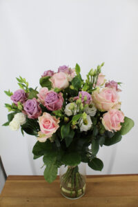 Mooi hand gebonden boeket met alleen maar Nederlands product. 15 rozen in 2 kleuren en 3 Alstroemeria roze en 3 Lisianthus wit (dat lijken wel roosjes) Alles 60-70cm.