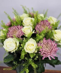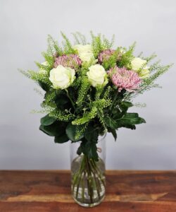 Dit boeket van Rozen.nl is een prachtig boeket dat bestaat uit 5 oud roze chrysanten, 10 White Avalanche rozen en 5 Thlaspi. Dit boeket heeft een elegante en romantische uitstraling, die perfect past bij elke gelegenheid. Of je nu iemand wilt verrassen, feliciteren of bedanken, dit boeket zal zeker indruk maken.