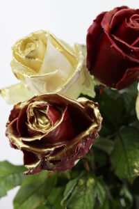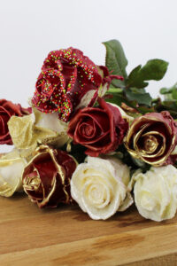 Witte roos gedoopt in een Choco wax bad en afgewerkt met een goud laagje.