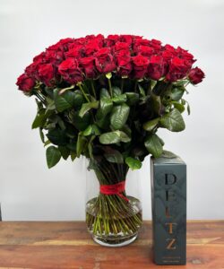 Möchten Sie Ihre/n Liebste/n mit dem ultimativen Geschenk zum Valentinstag überraschen? Dann bestellen Sie jetzt diesen wunderschönen Strauß mit 100 roten Naomi-Rosen, den beliebtesten und luxuriösesten roten Rosen im Angebot. Dazu gehört auch eine Flasche Deutz Champagner.