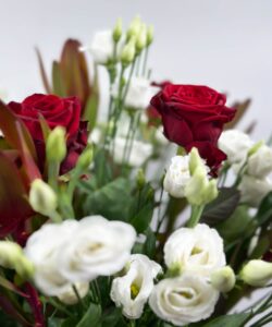Are you looking for an original and atmospheric gift? Then choose this beautiful bouquet from rozen.nl. This bouquet consists of 7 red naomi roses, 7 leucodendron and 7 white lisianthus. Together, these flowers form a harmonious ensemble of red, white and green. Order now and make yourself or someone else feel happy with this gorgeous bouquet from rozen.nl.