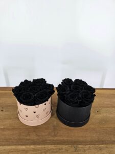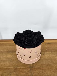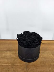 A sweet-sized rose box, filled with 7 black Longlife roses that stay beautiful for a very long time. By that we mean at least a year or more. You can enjoy these every day.