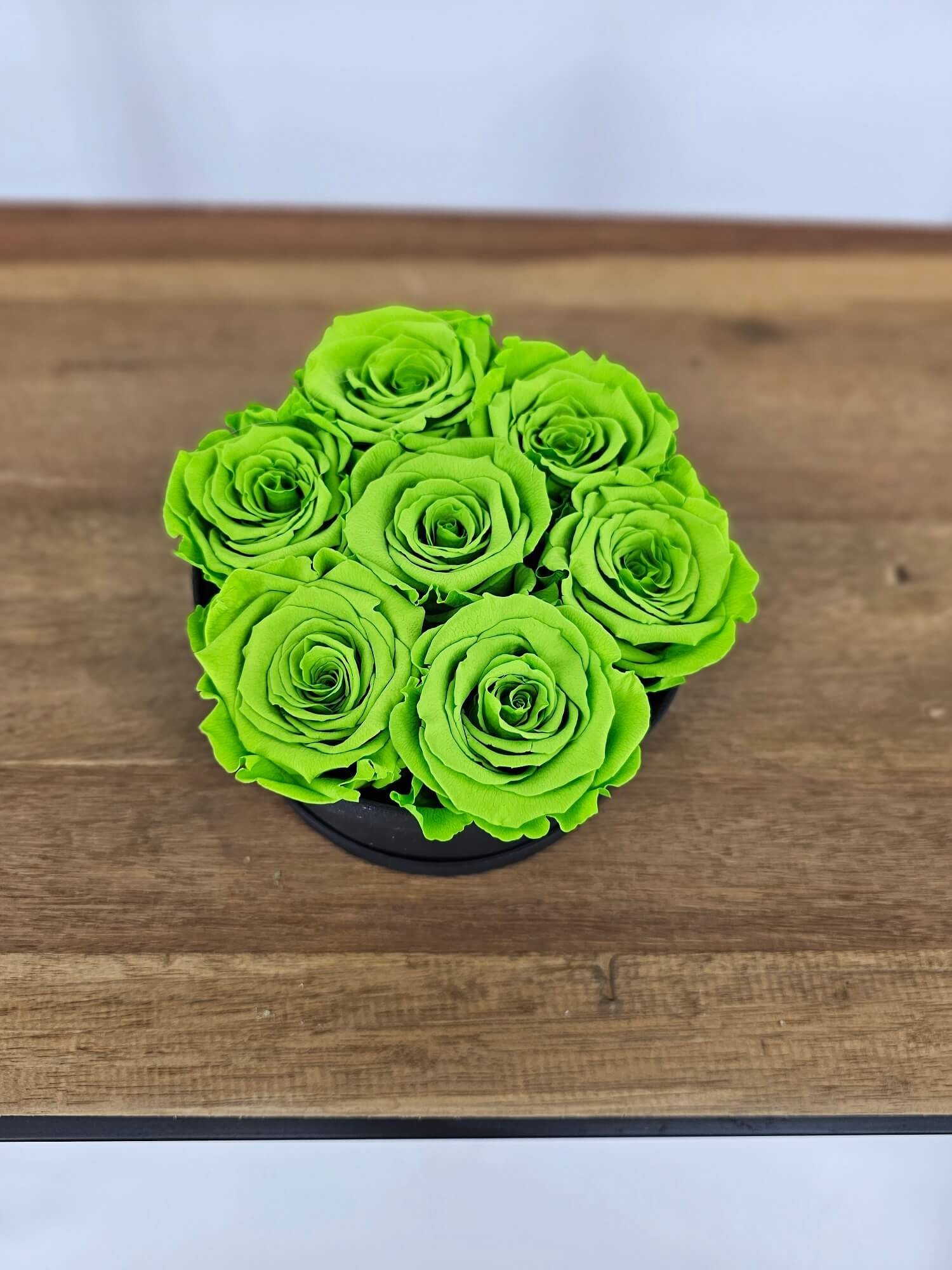 Een lief formaat rozenbox, gevuld met 7 groene Longlife rozen die heel lang mooi blijven. Dan bedoelen we zeker een jaar of langer. Daar kan je iedere dag van genieten.