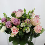 Mooi hand gebonden boeket met alleen maar Nederlands product. 15 rozen in 2 kleuren en 3 Alstroemeria roze en 3 Lisianthus wit (dat lijken wel roosjes) Alles 70cm.