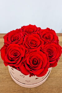 Une boîte à roses de taille douce, remplie de 7 roses Longlife qui restent belles pendant très longtemps. Nous entendons par là au moins un an ou plus. Vous pouvez en profiter tous les jours. Rouge, bien sûr, mais nous pouvons les fabriquer dans de nombreuses autres couleurs sur demande.
