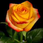 Een bijzonder mooie verschijning, een oranje vlam met rode accenten, naarmate de roos verder open gaat veranderd de kleur meer naar geel.