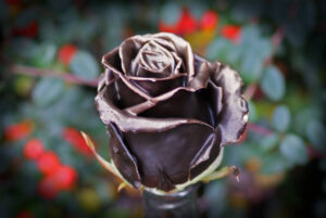 Witte roos gedoopt in een Choco wax bad en afgewerkt met een goud laagje