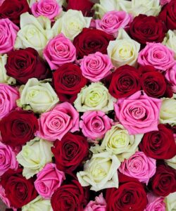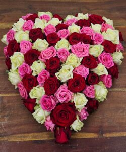 Deze rouwkrans in de vorm van een hart is 35cm bij 40cm in diameter en bestaat uit 3 verschillende kleuren rozen, namelijk; Rode Rozen, Witte Rozen en Roze Rozen.